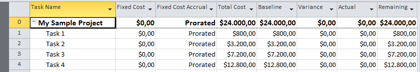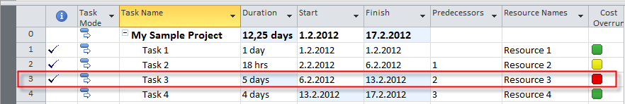 Task 2 has a Baseline Cost: 3 days * 8 hours per day * $300 per hour = $7.200. Actual cost = 5 days * 8 hours per day * $300 per hour = $12.600. Since Actual Cost – Baseline cost = $12.000 – $ 7.200 = $4.800, and it is greater then $1.000, the Red indicator appears!