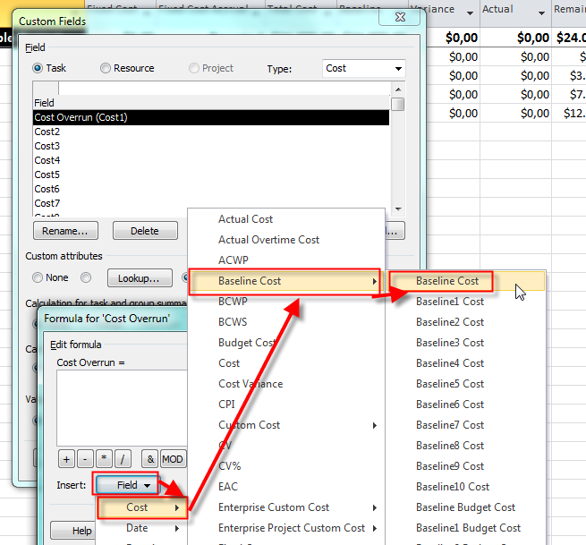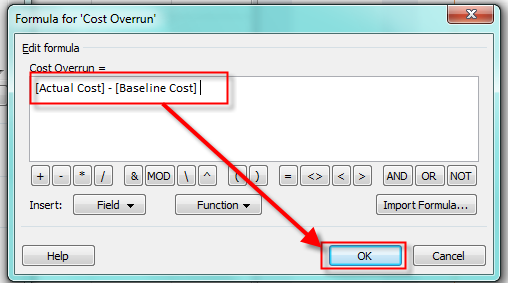 Now I will choose the minus sign, and Actual Cost, and then Baseline Cost: