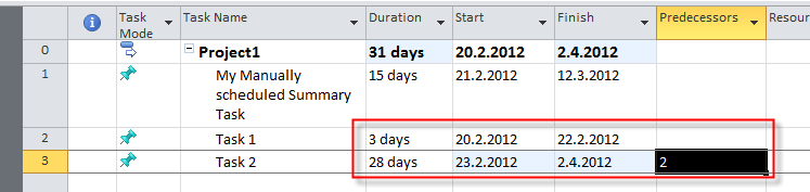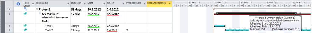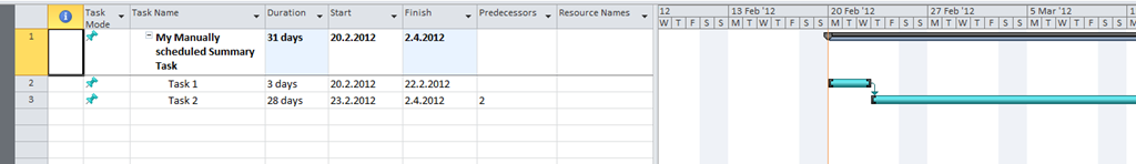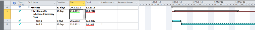 - Change dates but keep task Manually Scheduled. If you choose this one, Summary Task will have start date 20.02.2012, finish date 2.4.2012, and mode for this task remains Manually.