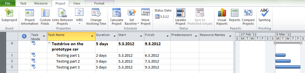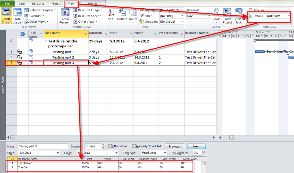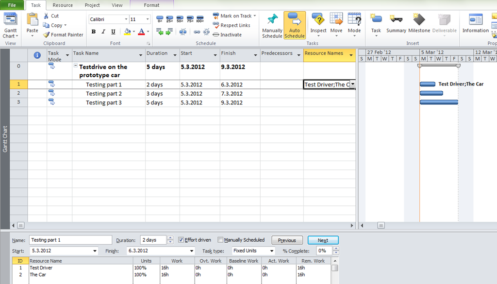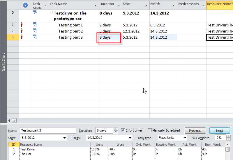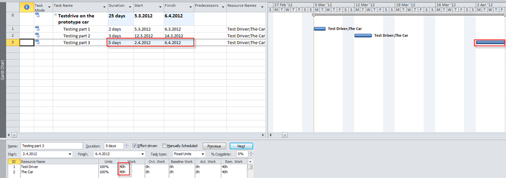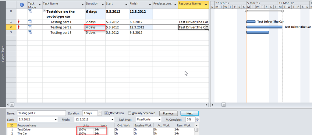 Notice that duration is now 4 days instead of 3, because my Car Resource is not available from 07.04.2012 till 11.03.2012, and it is over allocated from 05.03.2012 till 06.03.2012 (because this Car can not be used for Task1 and Task2 at the same time!)