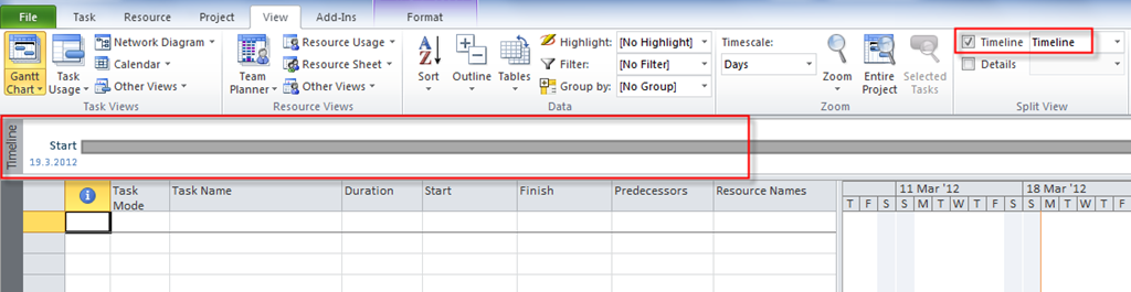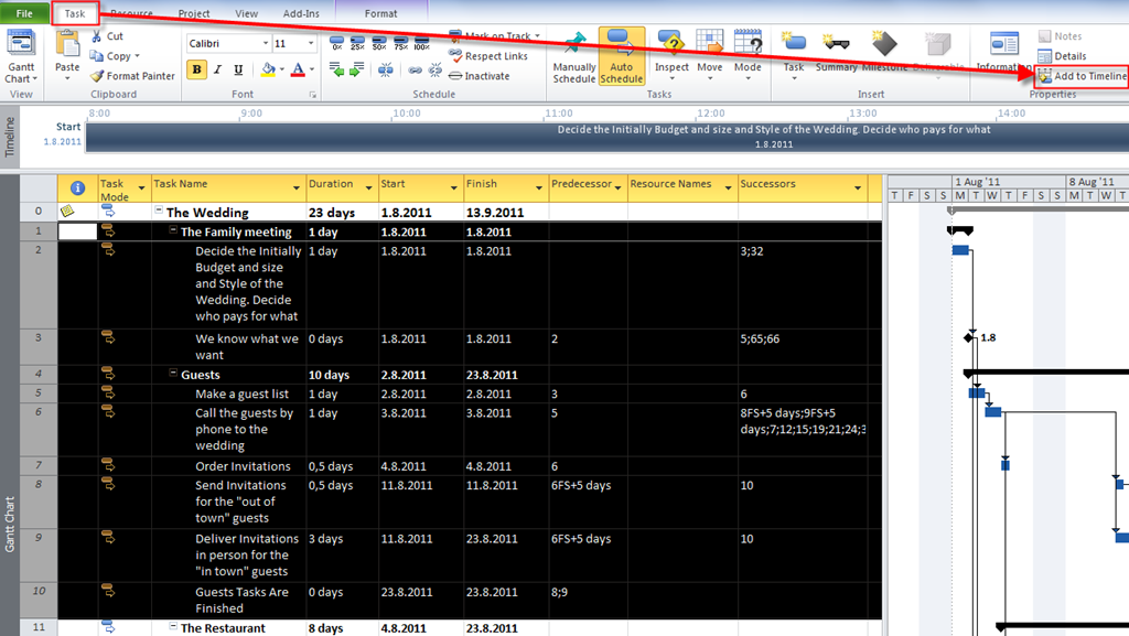 Now I want to add all Tasks from The Restaurant group. I will click anywhere in the Timeline and then I will choose the Format Tab: