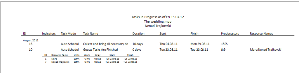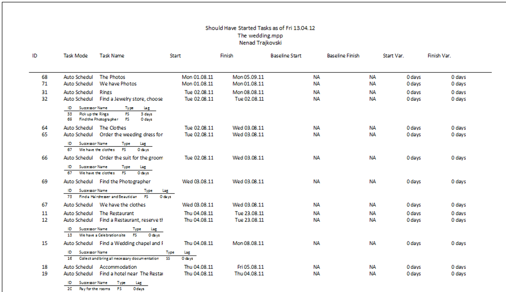 Last report in this section is Slipping Task Report. To get results you must have a Baseline. Slipping tasks are those with Start date greater than Baseline Start date: