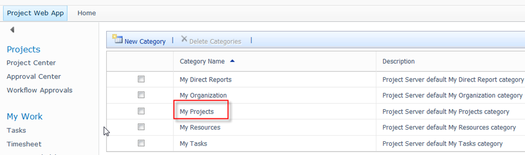 this post will be a short one! I will show you Permissions Cumulative Behavior in MS PROJECT SERVER 2010. First I will open, for example, Manage Categories view: