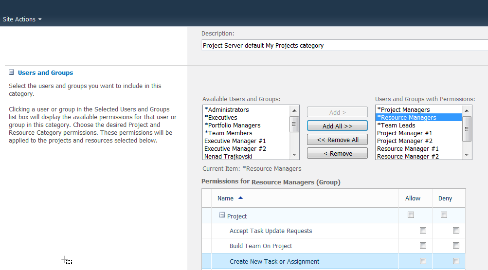 Now, user has set that permission to Deny in Resource Managers group, and Allow in the Project Manager group, and that means that the user will NOT BE ABLE to Create New Task or Assignment!