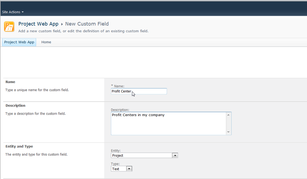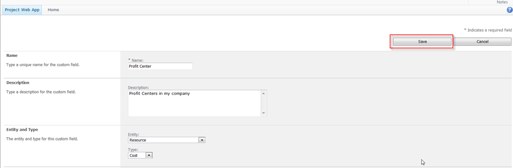 For my example, I will choose Resource entity and Text type, because I want that every Resource belong to Profit Center, no matter on which Projects or Tasks will they work on! I will also make this field as Required!