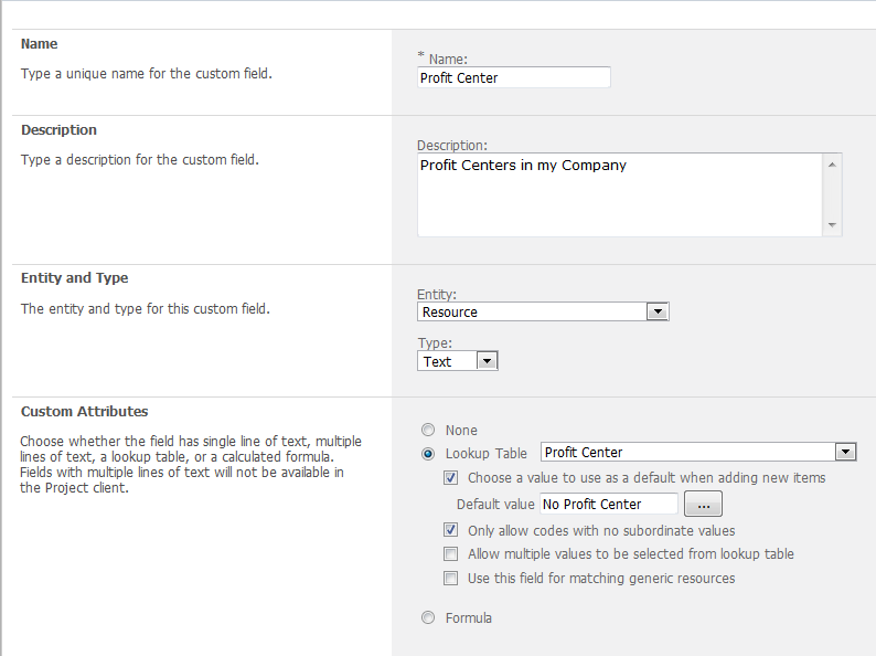 - Custom Attributes: Lookup Table is Profit Center , and I want that default value is No Profit Center. So If a user does not specify any value this will be default. I also want user to choose low level value from my hierarchy.