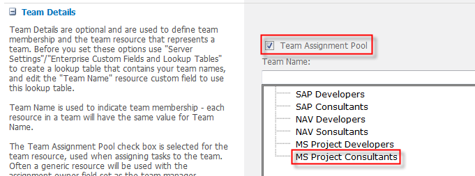 In this Post, I will show you how to create teams in MS PROJECT SERVER 2010. If you red my previous Posts, you have noticed that, for example, RSB lookup field it is built in RBS lookup table in MS PROJECT 2010. But, for the built in Team Name custom field, there is no built in Team Name or any other lookup table!