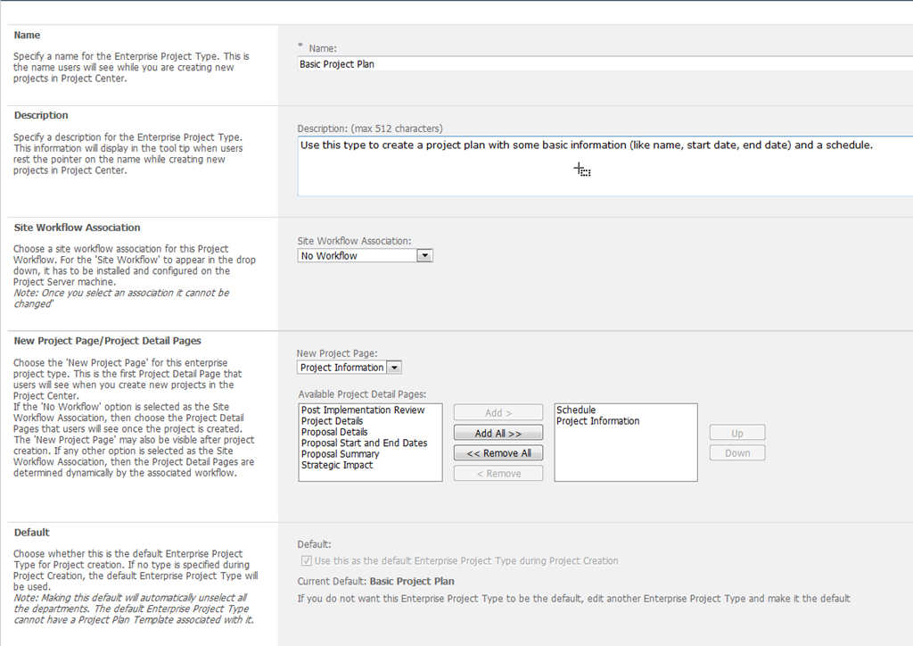Because I am a very lazy person, I will use a Basic Project Plan to show you this functionality, instead of building my own Project type, which can be done if you click on New Enterprise Project Type, shown on the picture above!