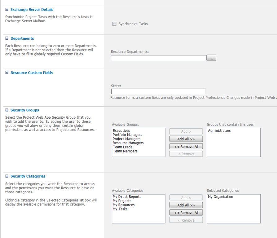• Synchronize Tasks: Choose this if you want to enable task synchronization wit Microsoft Exchange for resource (of course you should set up both Microsoft Exchange and Microsoft Project Server before that