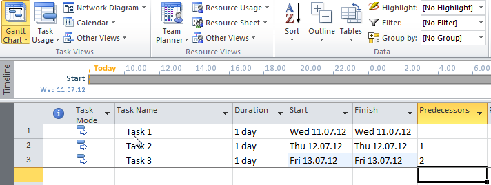 You can see that all three Tasks are on Critical Path. Why? Because Critical Path is Path which can have no delays. That means if any task is behind the schedule (late), the whole project will be late. So Task1 one should start at 11.07.12 (from 08:00 till 17:00 with one hour for lunch), Task2 should start at 12.07.12 (from 08:00 till 17:00 with one hour for lunch), and should start at 13.07.12 (from 08:00 till 17:00 with one hour for lunch)!