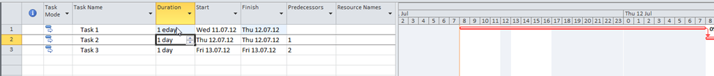 Everything is the same! Task 1 will start at 11.07.12. at 08:00 and will finish at 12.07.12 at 08:00 (24 hours). That looks fine! But what if I have Task2 with duration 1ed instead of Task1?