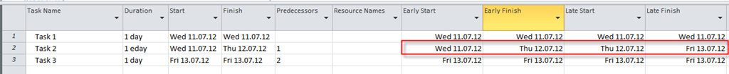 • Late Finish: Task 2 has Late Finish just before Task 3 must start, and that means it can Start at 13.07.2012, at 08:00 (08:00 AM).