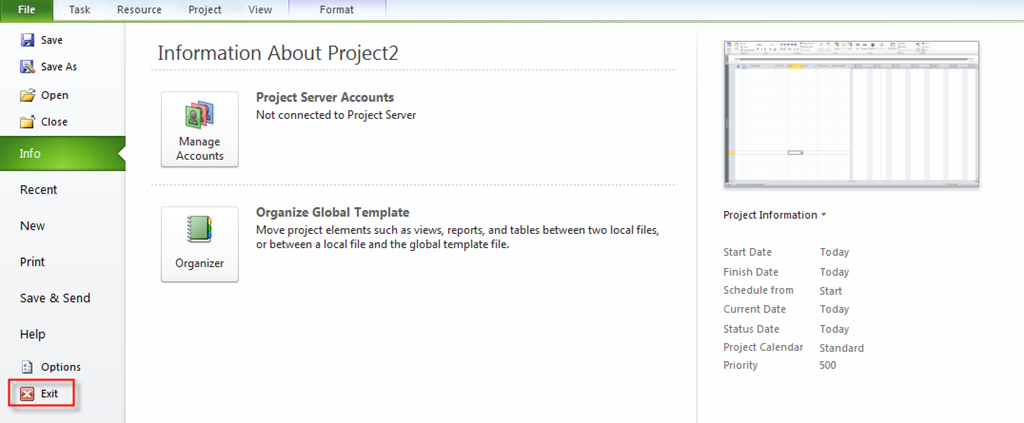 But if you hit X letter when you are on the backstage window in MS PROJECT 2013, you will exit! Of course you can exit if you click here, as well: