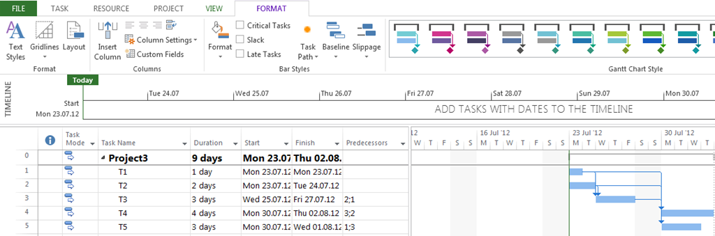 As you can see Task T3 has Predecessors: T1, and T2!