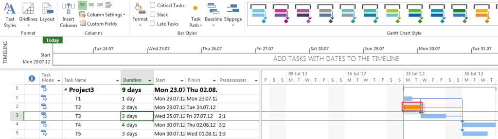 Firs, I will choose, Predecessors option for the T3 Task, and I will get: