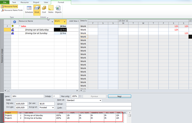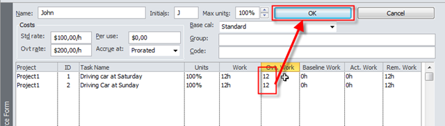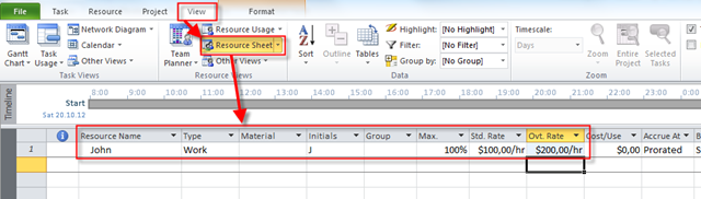 I will add John as Resource with $100 as Standard Rate, and $200 as Overtime Rate: