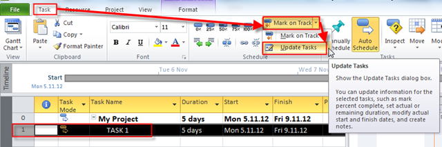 Now, suppose that this Task was started as Scheduled, but Finished on Monday instead on Friday! I will now put those Information in MS PROJECT 2010: