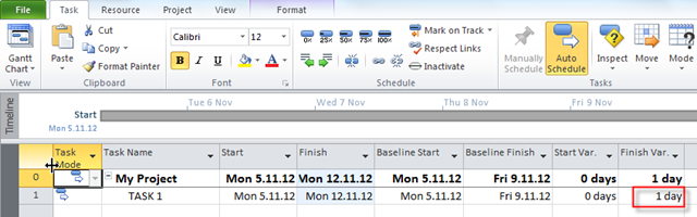 The formula is: Finish Var. = Finish – Baseline Finish – Non working days, and in my example it is (12.11.2011-09.11.2012) – 2 (Saturday and Sunday) = 3-2=1