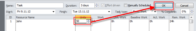 and you can see, that Duration is changed, according to the formula: DURATION * UNITS = WORK, e.g. Duration * Units 50% (4 hours per day) = 24 hours Fixed work –> Duration = 24/4 = 6 days!