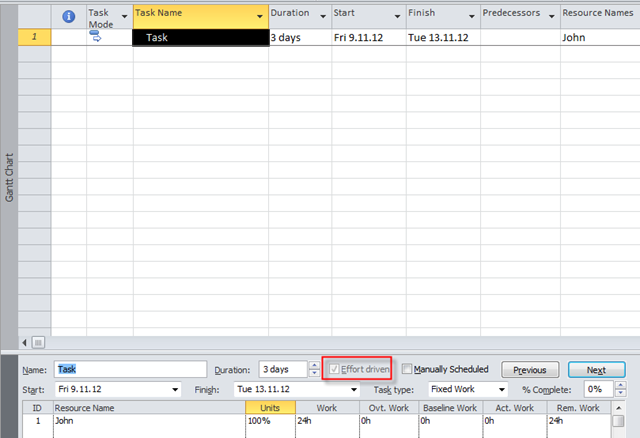 As you can see, I still need 24 hours of Work for the Task, but since I have Mary on board, both John and Mary will spent less hours on this Task. And that is what effort driven means. And you can see effects of Effort Driven Task when you add or remove a resource/resources to/from Tasks.