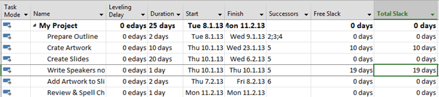 As you can see, The Critical Path is: Prepare Outline –> Create Slides –> Add Artwork to Slides –> Review & Spell Check. Tasks Crate Artwork, and Write Speakers Notes are not on the Critical path and they have a Slack!