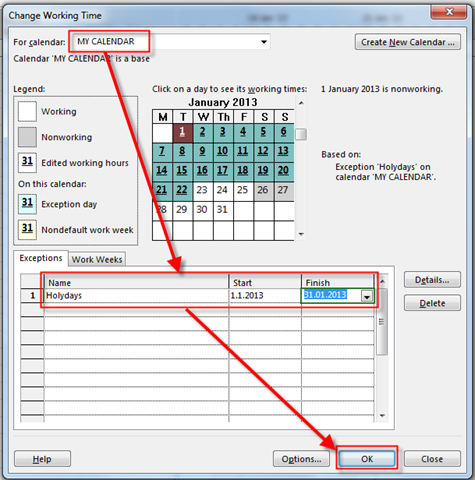 I will create Calendar with “MY CALENDAR” name, and I will, just for example, make an exception like Holydays from 01.01.2013 to 31.01.2013: