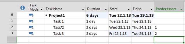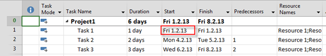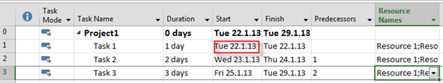 As you can see Start date of Task1 is 22.1.2013. Now I will assign the MY CALENDAR to the Project: