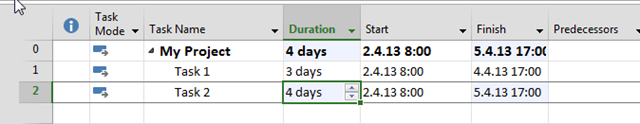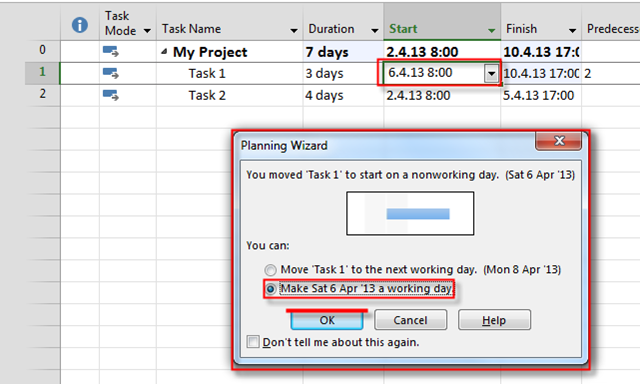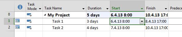 Now, I am going to set Start date for Task 1, and Task 2. Task 1 will have 06.04.2013 (Saturday) as Start date, and Task 2 will have 07.04.2013 (Sunday) as Start Date: