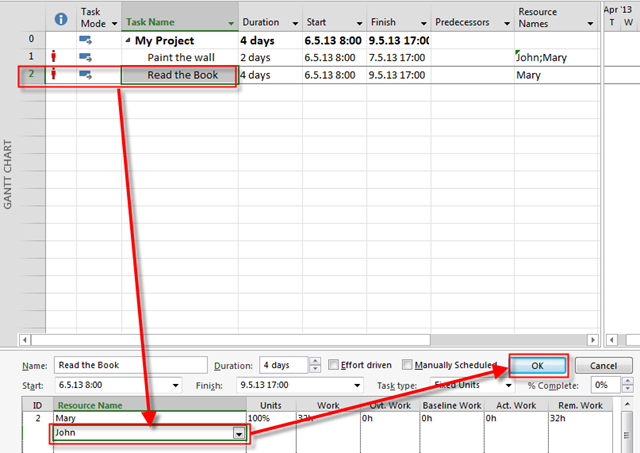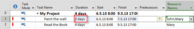You can see that the Task in Non effort driven, and that Mary will spend 32 hours of work (4 days * 8 hours per day).