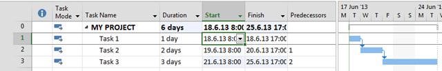 if you are working with MS PROJECT 2013 (or 2010), you may want auto linking Tasks! First I’ll show you what’s happening if you do not turn on this feature. I will create 3 Tasks and I’ll link them:
