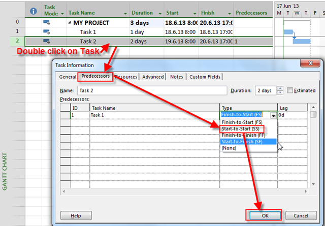 Let’s say that I want to break this predecessor so Task 3 has only Task 2 as predecessor and New Task to have Task 3 as predecessor.