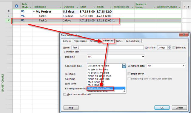 Now suppose that you have a demand that Task 2 should start at first available working day after predecessor finishes. The cleanest way is to put a constraint at the Task2 and that constraint is so called semi flexible, and it will be: Start no earlier than: