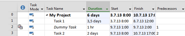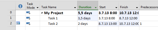 You can see that Task 2 will start at 05.07.2013 and that is exactly what I wanted – the day after Task 1 will finish. Again I’m going to extend duration to 3,5 days instead 1,5 days for Task 1. I’ll get: