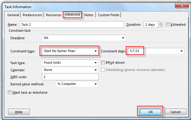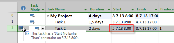 What happens? As you can see, Task 1 will finish at 08.07.2013, and Task 2 will start at the same day! Why? Well, because I told that Task 2 should Start no earlier than 05.07.2013. And it does not. It starts latter, at 08.07.2013, and the problem is same! It does not start next working day!