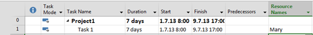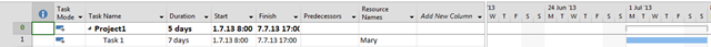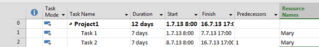 I’ve got what I want! If I now add Task 2 with 7 days duration, and the Predecessor is Task 1, and Mary should work on Task 2, I’ll get: