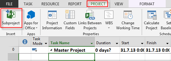 After closing MS PROJECT, and reopen it, I’m going to create Master Project with two Subprojects: