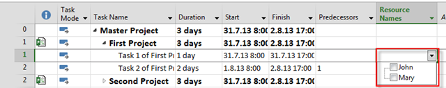 Good post and very helpful however a minor change to the screen shots would save a big headache which is what the comment revolves around! I had a similar issue with this whereby when adding the the sub projects to the master the drop down link was blank in the master project, and you could not assign from the resource pool even though i could see the resources in Resource sheet . I think the confusion here is that the screen shots do not show that you added resource names to task in the First and Second project before saving (Screen shots only show up to “Predecessors” column), if this is not done this does not appear to pull through the options into the master document when you bring in the sub projects,