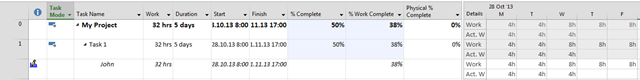 On the other hand, John is supposed to work 32 hours to complete his Task. Hi already worked 12 hours (4 hours at Monday, 4 hours at Tuesday, and 4 hours at Wednesday). Simple math:  %Work = 12 hours (Sum of Actual hours)/ 32 (Sum of work) = 0,375 = 38%