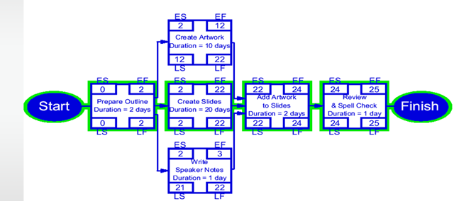 As you can see Work Package: The wall will have 5 days of Duration, because in network Diagram the longest duration for Activities will take 5 days (together).