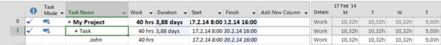 As you can see, Work is 40 hours but Duration has changed to 3,88 days! If it is not what you wanted (and, for my case it is not) I can put actual hours manually, like this: