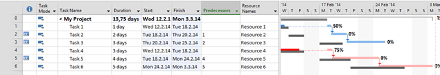 As you can see, Task1, and Task 4, are split, an all other Tasks are moved with Respect on their Predecessors. Remaining parts of Task1 and Task 4are supposed to star the day after Status date, in my example at Tuesday, 18.02.2014.
