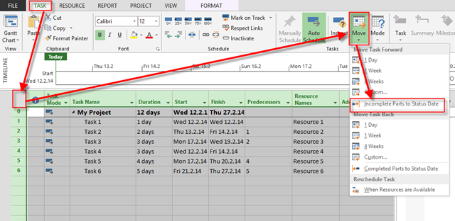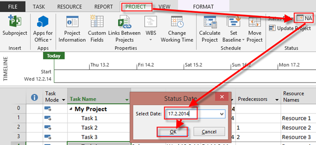 Now suppose that current date is Tuesday, 18.02.2014, and I have a meeting with my Team. I find that nothing changed, so, basically the Project will be late. There is no way that anyone can work on Task in a past. So my Schedule is no accurate any more. Now, I have to Reschedule all Tasks (unfinished) to , so called, Status Date, which is Monday, 17.02.2014! TO do that, firs I’ll enter the Status date: