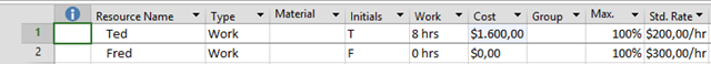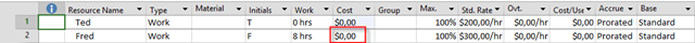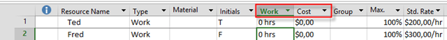Yu can see that Standard Rate for Ted is $200, and for Fred is $200. In this View (Resource sheet) I will add two more columns: Cost, and Work: