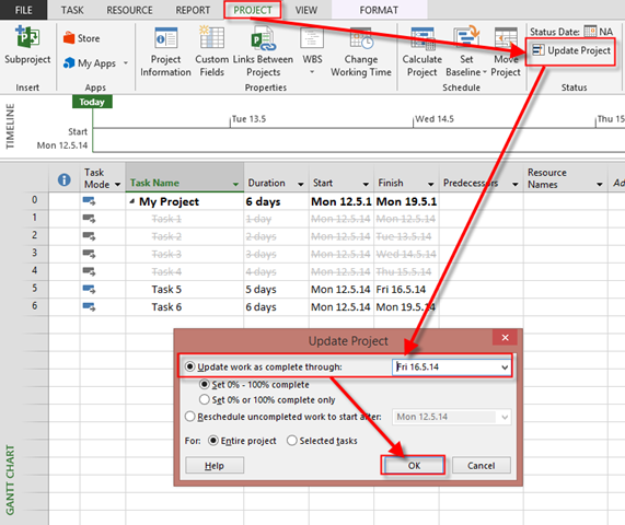 So far so good. Now, let’s say that all Task (active Tasks) which are supposed to be Finished at Friday, 16.5.2014 are finished. Notice that 16.5.2014 is date which is AFTER all inactive Tasks. I’ll do this like this: