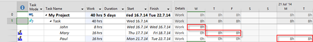 Now, suppose that John Will work only at Wednesday, Mary at Thursday and Friday, and Paul at next Monday and Tuesday. I will use Task Usage View for that: