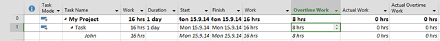 John is suppose to work on that Task 2 day, e.g 16 hours (8 hours per day). But I want for John to work overtime, so I will assign 8 hours as overtime work for that Task: