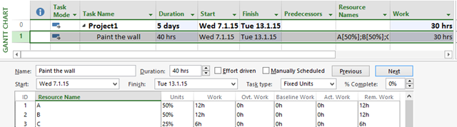 Now I will assign all Resources (A,B, and C) to the Task (Fixed Units type), and I’ll explain results: