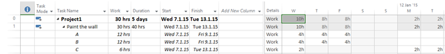 On Jan 9th, 2015 – Since resource3 can’t work, Resource1 and Resoure2 will work 3+3 = 6 hrs – I will explain this expectation. Since expected duration is 24 hours, my Blog Reader expect that remaining work at Jan 9th is 24 (total) – 10 (Jan 7th) – 8 (Jan 8th) = 6 hours. And since at Friday, Jan 9th Resource C is unavailable, and other two resources are, they should split work among them. But MS PROJECT does not work that way. Instead, it will wait to Resource C to finish his/her work when he/she is available. And that is reasonable, because Microsoft Project can not “remove” work for Resource C, just because it is unavailable at some dates.