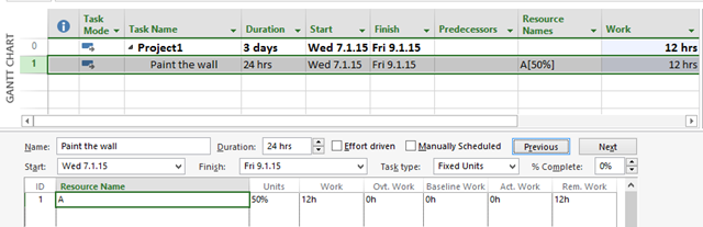 So Work = 24 hours * 50% = 12 hours. And That means that Resource A will work 3 days, 4 hours per day. In other words, Resource A will finish this 3 day work in 12 hours!