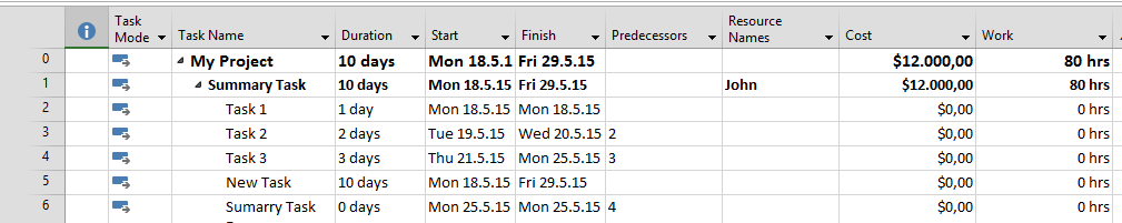 You can see that Total Cost for Summary Task is $12.000 (10 days * 8 hours per day * $ 150 per hours), and total Work is 80 hours (10 days * 8 hours). TIP TIME! Do not assign any Resource to Summary Task! If you want to get real work in hours and real Cost, assign john to all Tasks, instead of Summary Task like that: